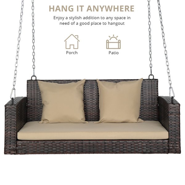 Here is our 49in Brown Gradient Rattan  Beige Cushion Rattan Swing Chair. This beautifully swing chair will complement your outdoor furniture setting.   Enjoy a nice sunny day or cool summer night; swinging on this elegant bench swing.   place a cushion on it for added comfort and enjoy this new patio swing during the day or night.   What are you hesitating about?   Buy it!
