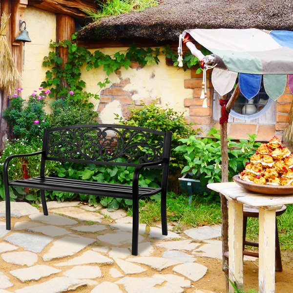This beautifully designed powder coated bench will add elegance to your front or backyard, which will be a great addition to garden or make a completion for your path. This bench features powder-coat steel construction to deliver durability and light weight, and the antique finish adds an attractive look to your patio or deck. The stylish design on the backrest provides a stylish look, and the bench is easy to assemble. Beautifully designed powder coated bench will add elegance to your front or backyard, ideal for along a path, under a tree, among the flowers or in your favorite peaceful spot.