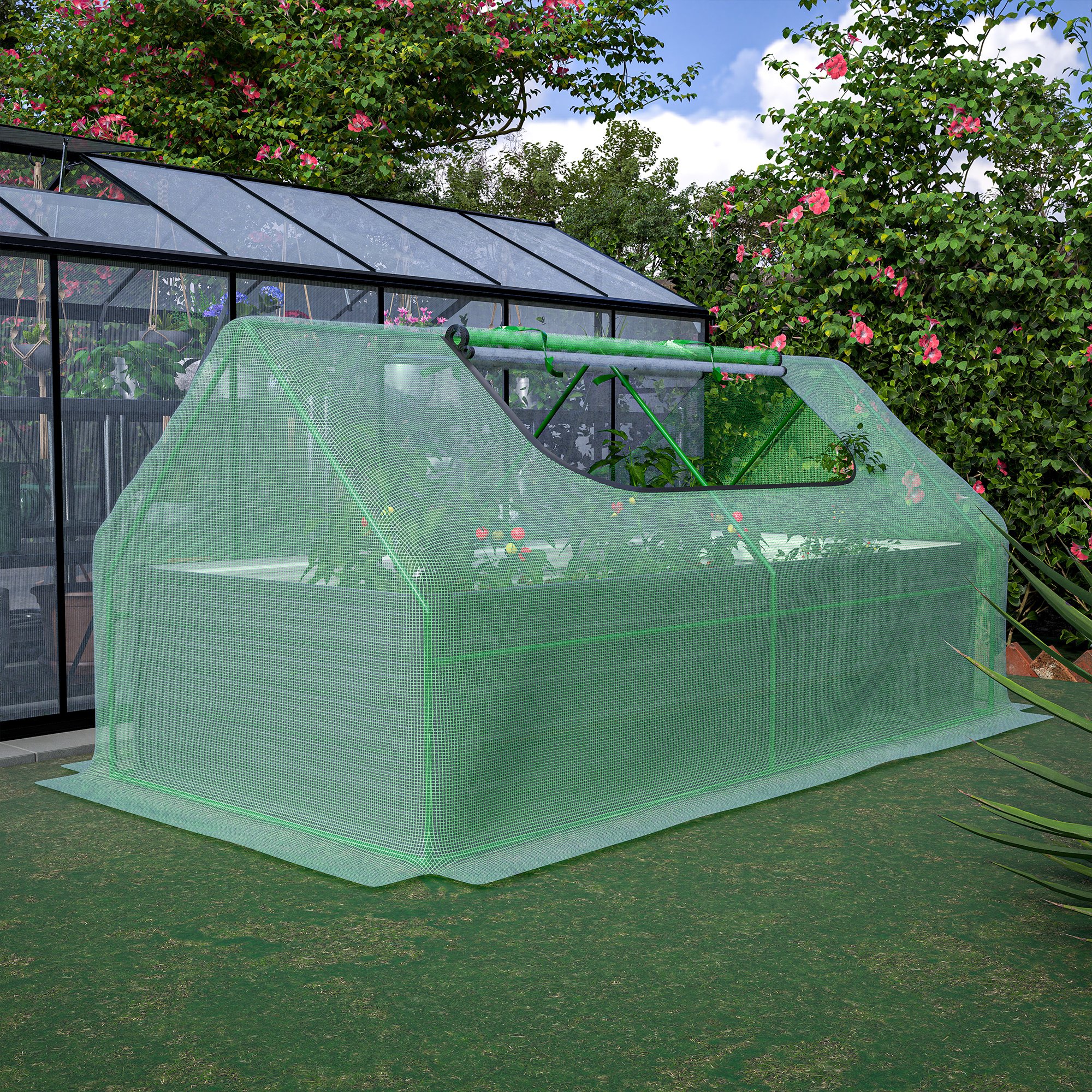 Transform your gardening experience with our raised garden bed with greenhouse. Crafted from premium PE material, it offers superior durability and weather adaptability compared to PVC ones. Seamlessly transition between a standalone garden bed, a greenhouse cover and their combination, catering to all your gardening needs. With essential greenhouse features and an innovative double-layered design, your plants are fulfilled with ample sunlight and ventilation. Anchored securely with ground stakes and offering hassle-free assembly, our greenhouse kit could be your ultimate gardening companion.
