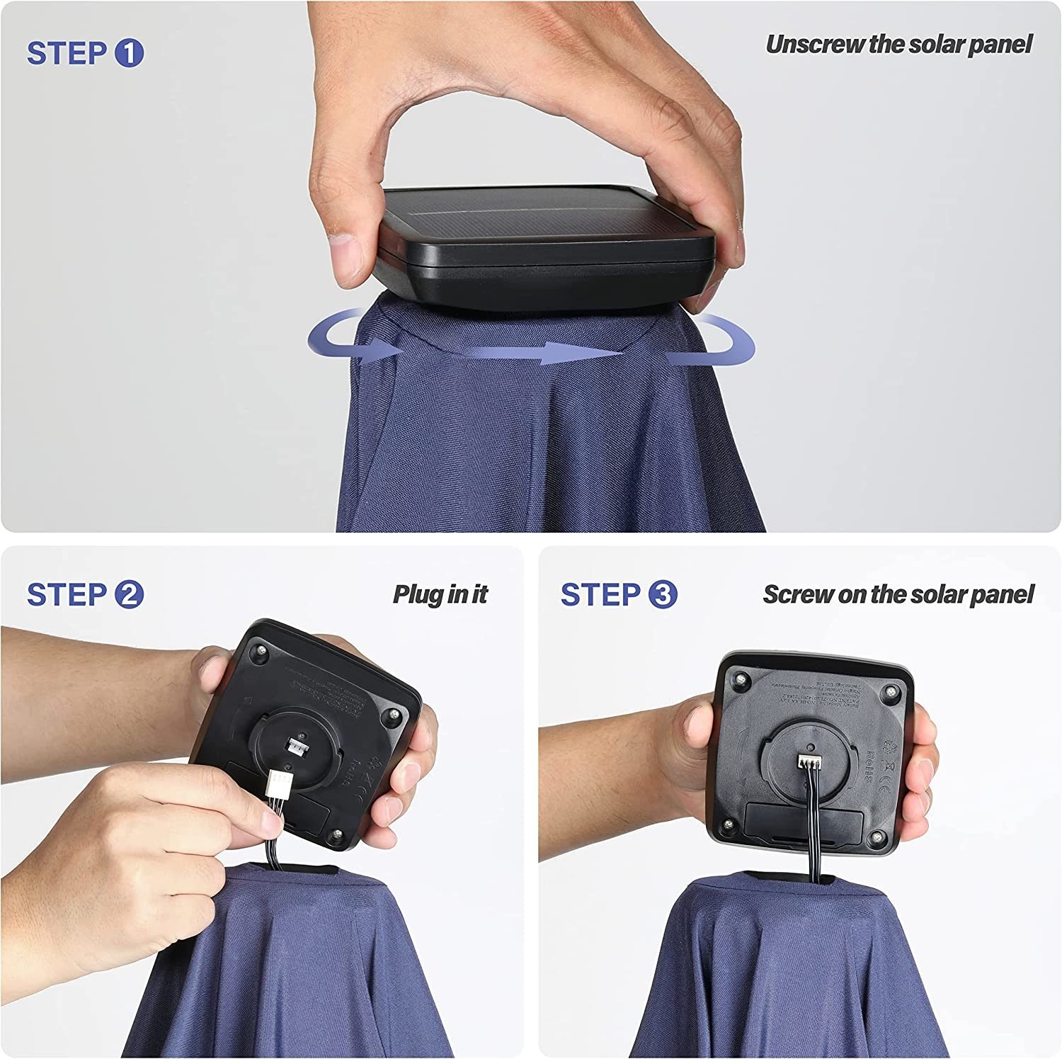 Energy-Efficient Lighting: Solar-powered 32 LEDs provide energy-efficient lighting with rechargeable NiMH battery,1800AM, 4 LED lights on each rib, 8 steel rib construction. The solar can work for 6-7 hours when battery is in full status
