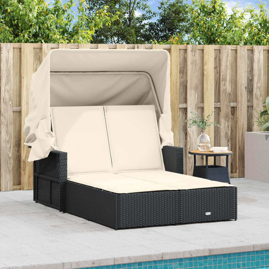Double Sun Lounger with Canopy and Cushions Black Poly Rattan