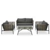 Rope-style: This outdoor furniture set features metal frames wrapped with weaving rattan into one impressive unity. Tight and elegant of the hand-woven rattan add a modern twist to the metal frame that is durable against the weather outside.
