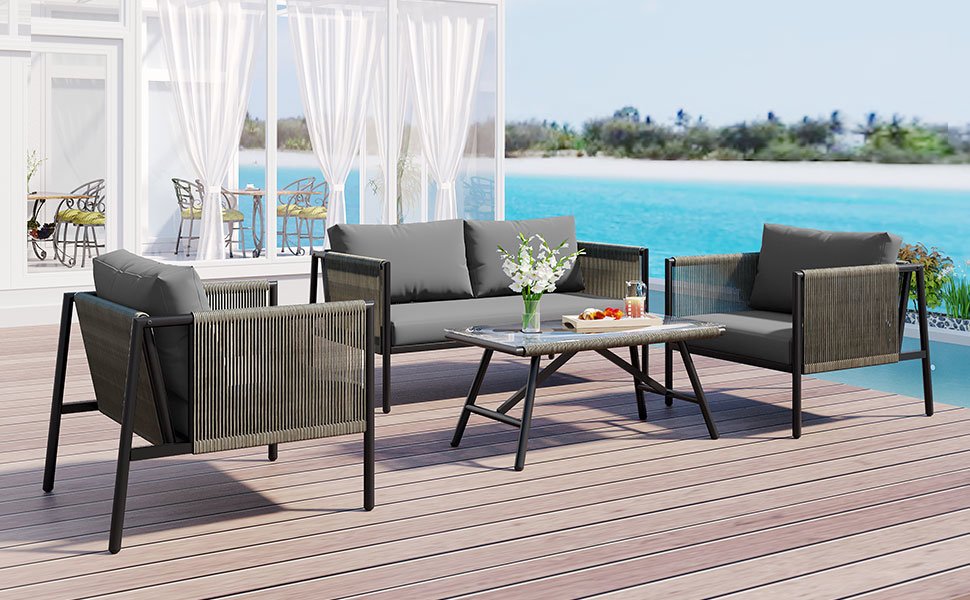 Crafted with meticulous attention to detail, each piece exudes sophistication and comfort. Metal frames seamlessly intertwine with hand-woven rattan in our Rope-style, creating a striking unity that withstands outdoor elements while adding a modern twist to your space. Sink into relaxation with our plush cushions and pillows in Ultimate Comfort, featuring built-in zippers for effortless maintenance and a luxurious seating experience. Ample table space awaits in our Spacious Table, perfect for drinks and snacks on the easy-to-clean glass-top surface, ensuring hassle-free enjoyment. Oversized seating areas invite you to unwind in luxurious comfort in Ergonomic Excellence, while adjustable feet provide perfect balance, making this set the focal point of your garden or patio.