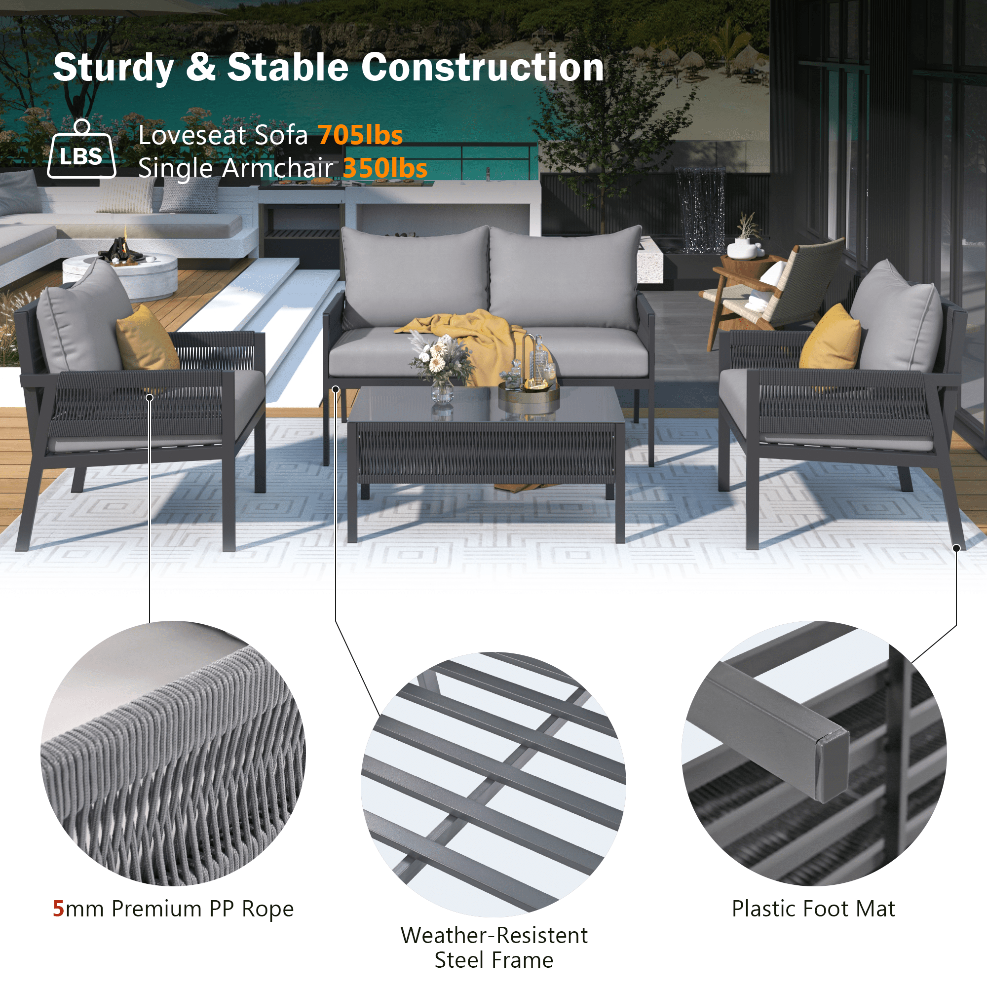 [Premium Material for Lasting Use] Our 4-piece boho patio furniture set is meticulously crafted from delicate 5mm PP rope, boasting a visually striking design and exceptional comfort. Compared to conventional rattan materials, the thoughtfully engineered frame and rope are specifically designed to withstand even the harshest weather conditions, offering enhanced tactile qualities and superior resistance to wear for optimal outdoor usability.