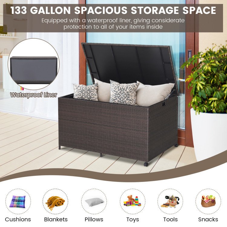 2.Solid Steel and Durable Rattan: The main frame of the storage box is constructed of heavy-duty steel, which is anti-deformation and rustproof. Moreover, the additional legs in the middle highly improve the overall stability. Wrapped with well-woven and colorfast PE rattan, the storage container not only looks elegant, but also withstands long-time outdoor use.