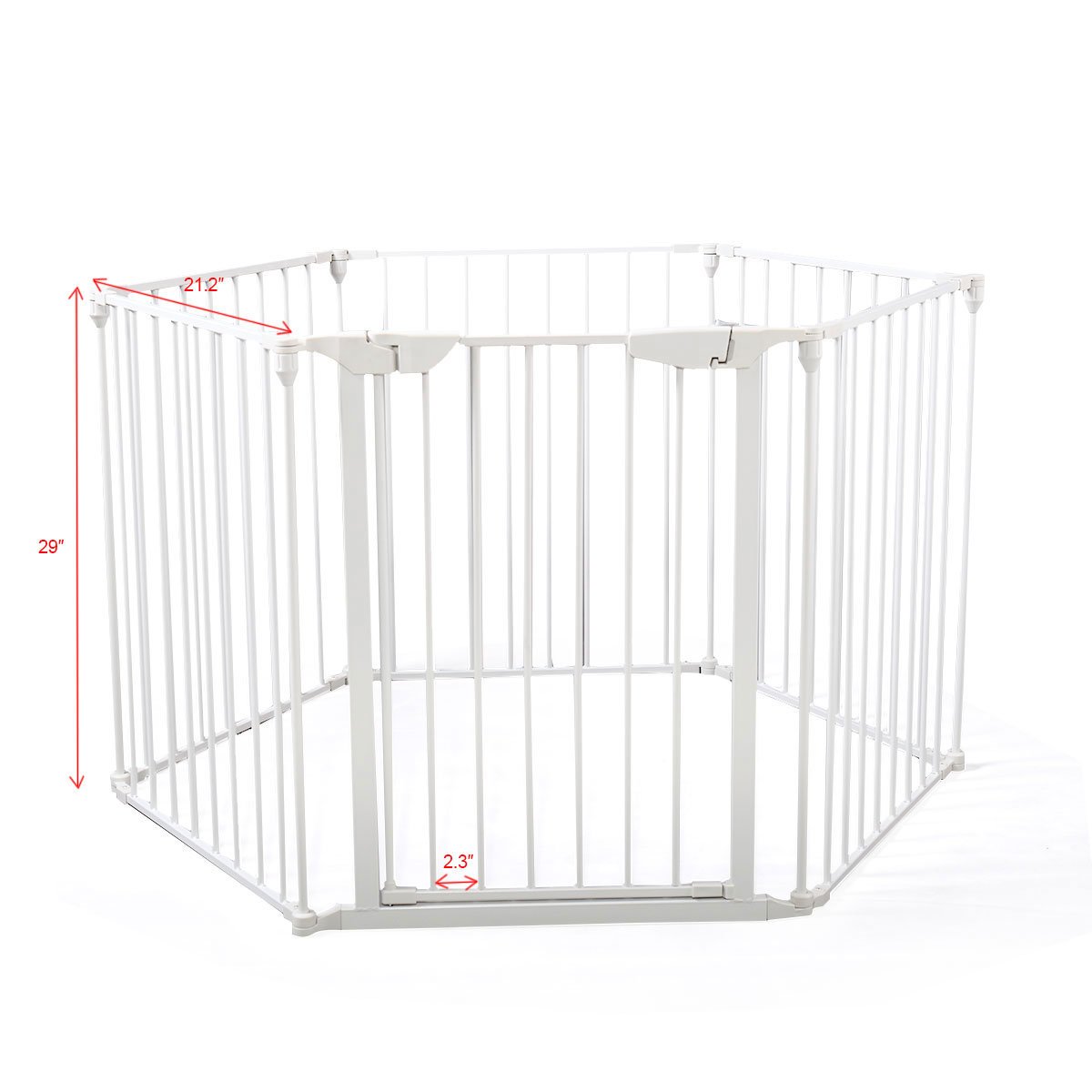 [5-in-1 Metal Gate]:6-panel fence offers spacious space for your baby to play. Good to keep your pet sleep in the yard. Set up on the doorway preventing your kid from getting down along. Safety fence for fireplace; Christmas tree. Creatingan extra-long barrier with the length of 146".